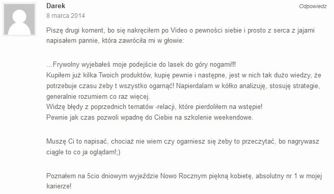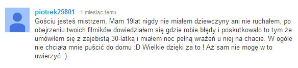 To jak radzisz sobie z testami kobiet w rozmowie to po prostu jakiś fenomen. Łatwo przeskakujesz z tematu na temat rozmawiając z kobietą i czuć po tym Twoją pewność siebie. W tym materiale dajesz ludziom swoje rozmowy z dziewczynami i praktykę co powoduje, że kurs jest wysoko-skuteczny. Łatwo zastosować to co mówisz dziewczynom do swoich kontaktów z dziewczynami. Jeśli chodzi o mnie to zawsze miałem problem z pewnością siebie przy kobietach i naprawdę jestem Ci wdzięczny, że robisz takie produkty bo mi on naprawdę pomógł. Teraz wiem jak rozmawiać z dziewczynami w pewny siebie sposób i widzę jakie robiłem kiedyś błędy. Bardzo podobał mi się też moduł o kontakcie wzrokowym gdzie omówiłeś paręnaście rodzajów tego jak pokazać pewnego siebie dziewczynie spojrzeniem. Całość dopełnia 20 misji do wykonania ale muszę Ci powiedzieć, że niektóre są naprawdę hardcorowe. Na razie utknąłem na zadaniu numer 2, ale czuję taki powiew świeżości i naprawdę muszę przyznać, że Twoje metody nauczania są genialne.