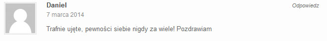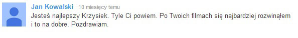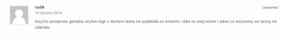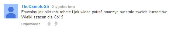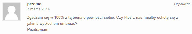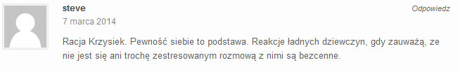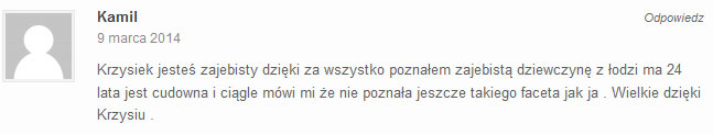 Fajnie, że tworzysz taki materiał. Ten kurs naprawdę pomaga. Ciągle słucham Twoich rozmów, które dostałem w mp3 i zaczynam rozmawiać z dziewczynami podobnie do Ciebie. One reagują teraz zupełnie inaczej. Czuję się lepiej, bardziej pewnie siebie. Krzysiek, naprawdę stokroć dzięki Ci za to ! A wszystkim innym polecam bardzo.